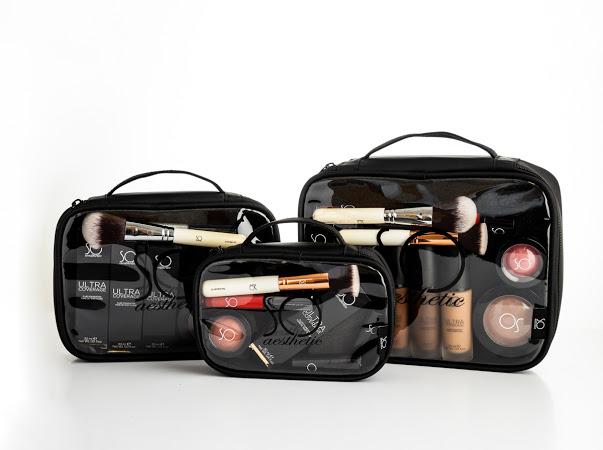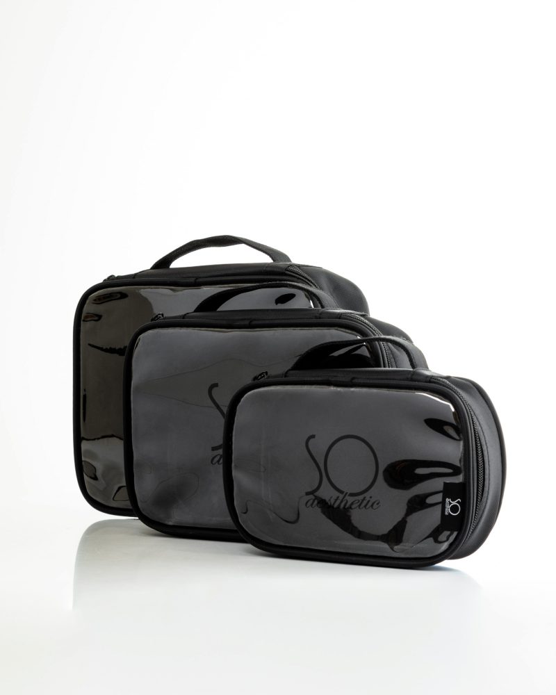 Three different sizes multi-purpose black makeup bags with a SO branded zip pull. It has a clear top that makes it perfect to carry all your daily makeup needs.